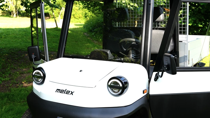 Der vollelektrische Melex Cargo, mit einer Traglast von 1 Tonne, fährt emissionsfrei und überzeugt mit einer Reichweite von bis zu 110 km – dank passender Zulassung sogar auf der Straße.